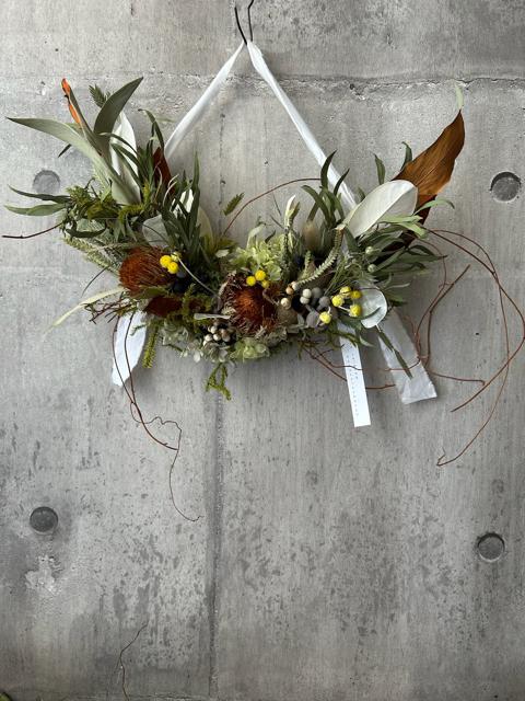 サイズ約11×35㎝長もちするドライフラワーとプリザーブドフラワーを合わせた長もちリース。ブラウンリーフやユーカリ、木の根を垂らしたり、ヒカゲノカズラを垂らして動きを大切に作りました。なるべく長く維持するドライフラワーを厳選していますが、時間経過によりいずれはドライフラワーの方から先に退色していきます。光や日差しが当たらない涼しい屋内の場所ですと、いい状態を保ちやすいです。お花が過ごしやすい場所に飾ってあげるのもいいのですが、1番飾りたい場所で飾っていただくのもいいかもしれません。
