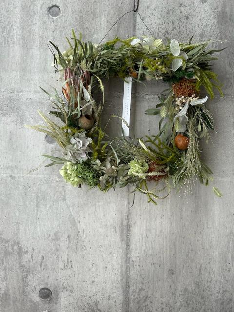 サイズ約30㎝植物のスクエア型のインテリア。プリザーブドフラワーとドライフラワーを混ぜ合わせたお花です。プロテアやドライアンドラなど少し控えめですがインパクトある仕上がりです。なるべく長く維持するドライフラワーを厳選していますが、時間経過によりいずれはドライフラワーの方から先に退色していきます。光や日差しが当たらない涼しい屋内の場所ですと、いい状態を保ちやすいです。お花が過ごしやすい場所に飾ってあげるのもいいのですが、1番飾りたい場所で飾っていただくのもいいかもしれません。