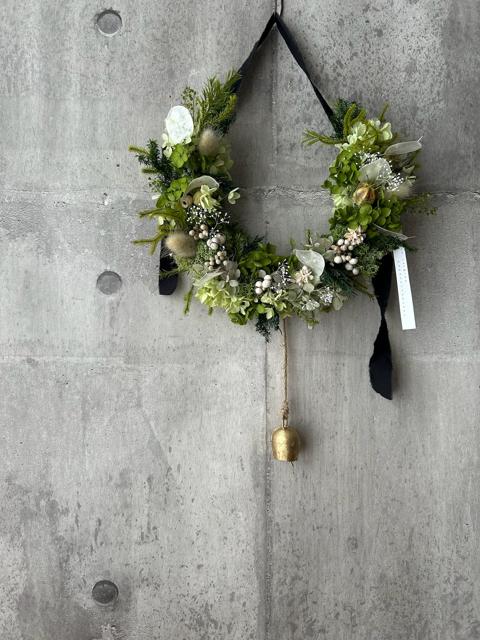 サイズ約24×26㎝グリーンいっぱいのベルリース。動きを付けたり全体的な形を印象的に作りました。長くお楽しみ頂けるプリザーブドフラワーで仕上げました。時間経過によりいずれはゆっくりと退色していきますが、飾る場所によって色もちは異なります。なるべく光や日差しが当たらない涼しい屋内の場所ですと、いい状態を保ちやすいです。お花が過ごしやすい場所に飾ってあげるのもいいのですが、お客様が1番飾りたい場所で飾っていただくのもいいかもしれません。