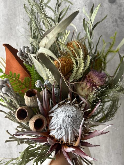 サイズ約50×30㎝ボリュームたっぷりのスワッグ。キングプロテアやアーティチョークやドライアンドラなど迫力ある花材を合わせました。プリザーブドフラワーとドライフラワーを混ぜ合わせたスワッグです。前撮りなどにもお使いいただける花材を集めました。なるべく長く維持するドライフラワーを厳選していますが、時間経過によりいずれはドライフラワーの方から先に退色していきます。光や日差しが当たらない涼しい屋内の場所ですと、いい状態を保ちやすいです。お花が過ごしやすい場所に飾ってあげるのもいいのですが、1番飾りたい場所で飾っていただくのもいいかもしれません。