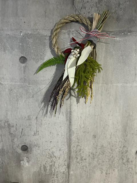 こちらは縄とお花を分けられますが和風の仕上がりとなります。縁起良いヒカゲノカズラ入り。シダや南天の葉やナンキンハゼなどお正月らしいお色味に仕上げました。サイズ約34×16㎝和の雰囲気がお好きな方におすすめです。