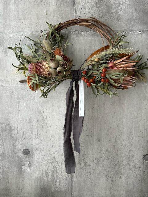 サイズ約25×45㎝長くお楽しみ頂ける色保ちの良いドライフラワーを使用しています。プロテアやアーティーチョーク、その仲間たちブラウンリーフが力強くて印象的です。時間経過によりいずれはゆっくりと退色していきますが、光や日差しが当たらない涼しい屋内の場所ですと、いい状態を保ちやすいです。お花が過ごしやすい場所に飾ってあげるのもいいのですが、お客様が1番飾りたい場所で飾っていただくのもいいかもしれません。