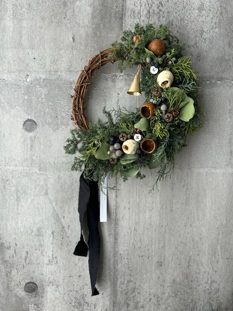 サイズ約28×22㎝。ドライフラワーのリースです。フレッシュからドライに乾燥しました。パリッと乾いているので杉の部分には触れずに優しくお取り扱いください。飾る場所は玄関内側ドアや、暖房をかけないお部屋、日陰がオススメ。クリスマスが近づいて来たら、みなさんのいるお部屋に移動させてあげるとリースもごきげんに過ごします。暖房の効いたお部屋は乾燥が早く進みます。室内日陰ですと冬の間変色することはないと思います。