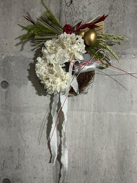 サイズ約20㎝長くお楽しみ頂けるプリザーブドフラワーで仕上げました。お正月が終わったらお花だけにしてお飾りいただけます。取り外し方は同梱しておりますのでご参考ください。時間経過によりいずれはゆっくりと退色していきますが、光や日差しが当たらない涼しい屋内の場所ですと、いい状態を保ちやすいです。お花が過ごしやすい場所に飾ってあげるのもいいのですが、お客様が1番飾りたい場所で飾っていただくのもいいかもしれません。外側ドアに飾った場合は、おうちの中へ移す場合は、お花をドライヤーなど遠くからあてて、湿気を飛ばしてからお飾りください。