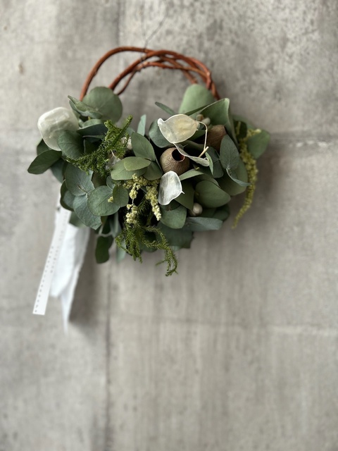 サイズ約18×20㎝ユーカリのドライフラワーメインで仕上げました。時間経過によりいずれはゆっくりと退色していきますが、飾る場所によって色もちは異なります。なるべく光や日差しが当たらない涼しい屋内の場所ですと、いい状態を保ちやすいです。お花が過ごしやすい場所に飾ってあげるのもいいのですが、お客様が1番飾りたい場所で飾っていただくのもいいかもしれません。