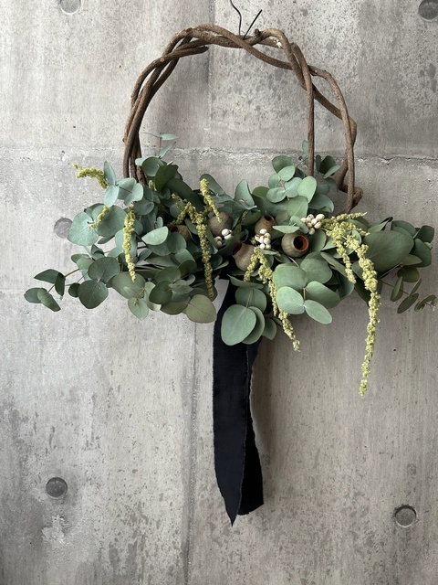 サイズ約35×40㎝ユーカリのドライフラワーメインで仕上げました。時間経過によりいずれはゆっくりと退色していきますが、飾る場所によって色もちは異なります。なるべく光や日差しが当たらない涼しい屋内の場所ですと、いい状態を保ちやすいです。お花が過ごしやすい場所に飾ってあげるのもいいのですが、お客様が1番飾りたい場所で飾っていただくのもいいかもしれません。