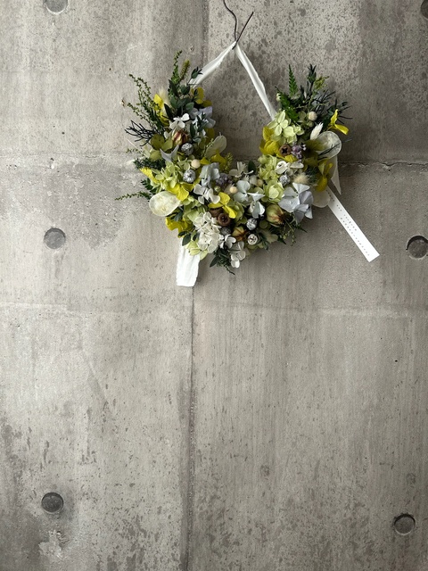 サイズ約23㎝長くお楽しみ頂けるプリザーブドフラワーで仕上げました。個性ある形でも優しい雰囲気にまとめました。時間経過によりいずれはゆっくりと退色していきますが、飾る場所によって色もちは異なります。なるべく光や日差しが当たらない涼しい屋内の場所ですと、いい状態を保ちやすいです。お花が過ごしやすい場所に飾ってあげるのもいいのですが、お客様が1番飾りたい場所で飾っていただくのもいいかもしれません。