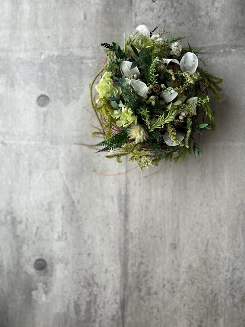 サイズ約23×20㎝長くお楽しみ頂けるプリザーブドフラワーで仕上げました。横から見ると厚みのある仕上がりに。葉の遊びを利かせて木の実やルナリアも相性バッチリです。時間経過によりいずれはゆっくりと退色していきますが、飾る場所によって色もちは異なります。なるべく光や日差しが当たらない涼しい屋内の場所ですと、いい状態を保ちやすいです。お花が過ごしやすい場所に飾ってあげるのもいいのですが、お客様が1番飾りたい場所で飾っていただくのもいいかもしれません。