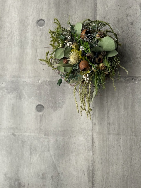 サイズ約23×20㎝長くお楽しみ頂けるプリザーブドフラワーとドライフラワーで仕上げました。葉の遊びを利かせて木の実やティーツリーなどグリーンを楽しむためのリースです。ドライフラワーの方から時間経過によりいずれはゆっくりと退色していきますが、飾る場所によって色もちは異なります。なるべく光や日差しが当たらない涼しい屋内の場所ですと、いい状態を保ちやすいです。お花が過ごしやすい場所に飾ってあげるのもいいのですが、お客様が1番飾りたい場所で飾っていただくのもいいかもしれません。