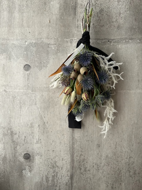 存在感あるドライフラワーで仕上げました。37×17㎝エリンジュームは乾燥が進むと触れた際にはチクチクとするので出来れば触れないようご注意ください。時間経過によりいずれはゆっくりと退色していきますが、飾る場所によって色もちは異なります。なるべく光や日差しが当たらない涼しい屋内の場所ですと、いい状態を保ちやすいです。お花が過ごしやすい場所に飾ってあげるのもいいのですが、お客様が1番飾りたい場所で飾っていただくのもいいかもしれません。