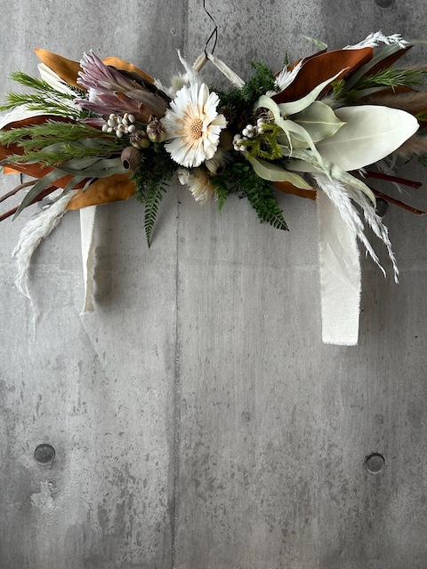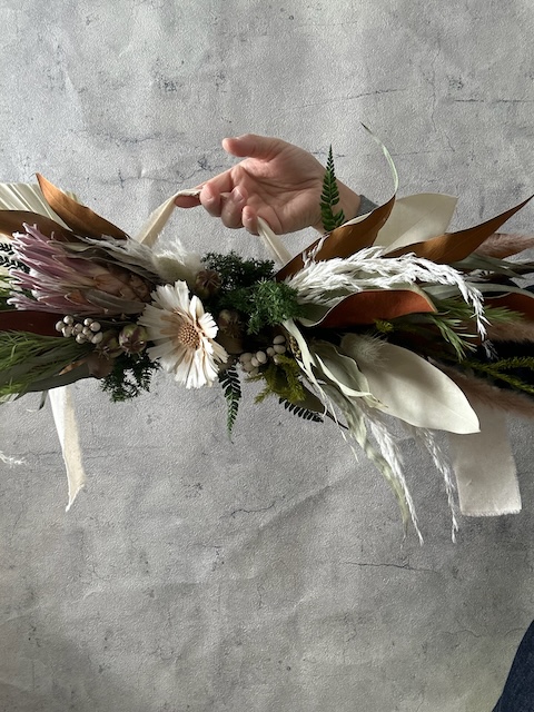 サイズ約20×60㎝プロテアやグレビレアなどインパクトある世界の植物を合わせました。プリザーブドフラワーとドライフラワーを混ぜ合わせたお花です。色の変化がしにくいドライフラワーを厳選していますが、時間経過によりいずれはドライフラワーの方から先に退色していきます。光や日差しが当たらない涼しい屋内の場所ですと、いい状態を保ちやすいです。お花が過ごしやすい場所に飾ってあげるのもいいのですが、1番飾りたい場所で飾っていただくのもいいかもしれません。