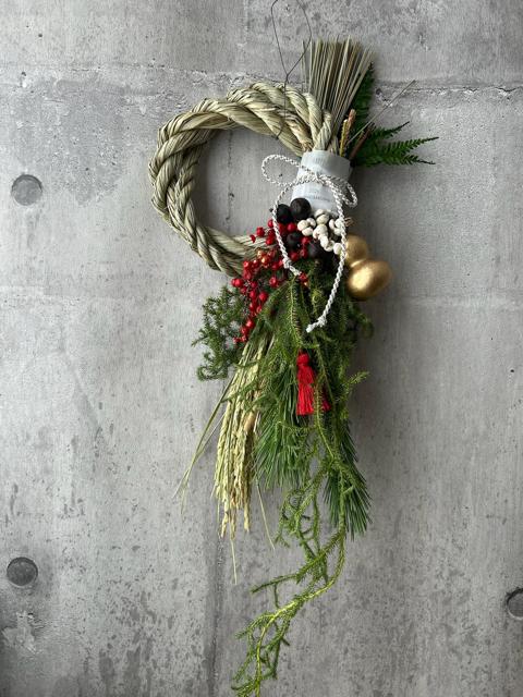 こちらは縄とお花が一体型で和風の仕上がりとなります。縁起良いヒカゲノカズラやひょうたんを合わせました。松や稲穂などお正月らしいお色味に仕上げました。サイズ約50×18㎝和の雰囲気がお好きな方におすすめです。