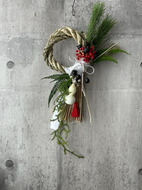 こちらは縄とお花が一体型で和風の仕上がりとなります。縁起良いヒカゲノカズラやひょうたんを合わせました。松や稲穂などお正月らしいお色味に仕上げました。サイズ約40×16㎝和の雰囲気がお好きな方におすすめです。