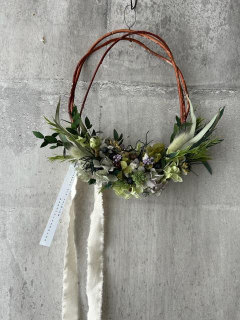 サイズ約25×23㎝長くお楽しみ頂けるプリザーブドフラワーで仕上げました。繊細な作りに仕上げ優しい印象に。時間経過によりいずれはゆっくりと退色していきますが、飾る場所によって色もちは異なります。なるべく光や日差しが当たらない涼しい屋内の場所ですと、いい状態を保ちやすいです。お花が過ごしやすい場所に飾ってあげるのもいいのですが、お客様が1番飾りたい場所で飾っていただくのもいいかもしれません。