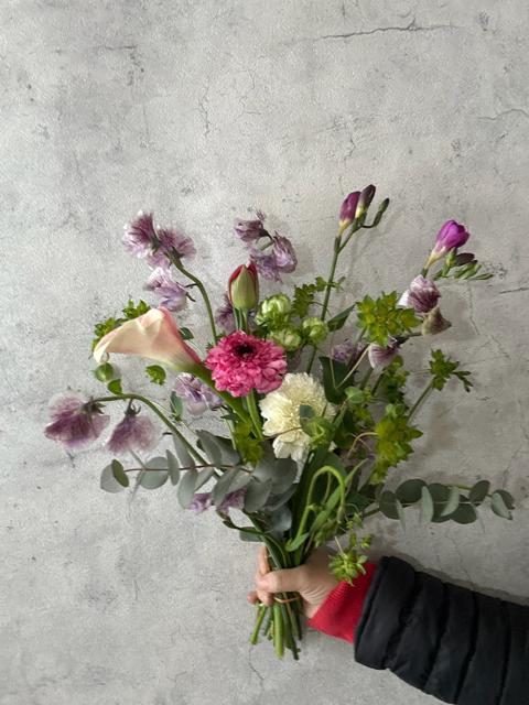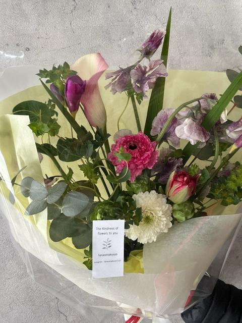 スイトピー4本、フリージア2本、ユーカリ2本、カラー1本、ププレリューム1本、ガーベラ1本、ラナンキュラス1本、チューリップ1本、スプレーバラ1本の9種類も入って全部で14本入り。今回限りの特別価格です。スイトピーとフリージアが特に香りがたまりません。ユーカリも銀世界なので香りもスッキリ。