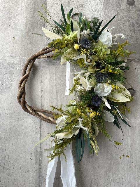 サイズ約32×42㎝写真より大きめのリース、通年飾れるタイプで長くお楽しみ頂けるプリザーブドフラワーと一部青のエリンジュームのみドライフラワーで仕上げました。ゆっくりご覧いただけましたら幸いです。ドライフラワーの方から時間経過によりいずれはゆっくりと退色していきますが、飾る場所によって色もちは異なります。なるべく光や日差しが当たらない涼しい屋内の場所ですと、いい状態を保ちやすいです。お花が過ごしやすい場所に飾ってあげるのもいいのですが、お客様が1番飾りたい場所で飾っていただくのもいいかもしれません。