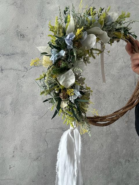 サイズ約30×26㎝長くお楽しみ頂けるプリザーブドフラワーで仕上げました。モスはドライを使用。空色のアジサイを少しずつ合わせて、たくさんのグリーンを重ね、ルナリアがひときわ目立つように仕上げました。時間経過によりいずれはゆっくりと退色していきますが、飾る場所によって色もちは異なります。なるべく光や日差しが当たらない涼しい屋内の場所ですと、いい状態を保ちやすいです。お花が過ごしやすい場所に飾ってあげるのもいいのですが、お客様が1番飾りたい場所で飾っていただくのもいいかもしれません。