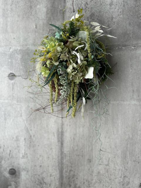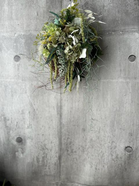 サイズ約33×45㎝長くお楽しみ頂ける色保ちの良いドライフラワーや、プリザーブドフラワーを使用しています。マグノリアリーフやグレビレアの葉が力強くて印象的。ブラウンにグリーンを合わせて遠目に見た時にメリハリが出るようバランスを考えました。時間経過によりいずれはゆっくりと退色していきますが、光や日差しが当たらない涼しい屋内の場所ですと、いい状態を保ちやすいです。お花が過ごしやすい場所に飾ってあげるのもいいのですが、お客様が1番飾りたい場所で飾っていただくのもいいかもしれません。