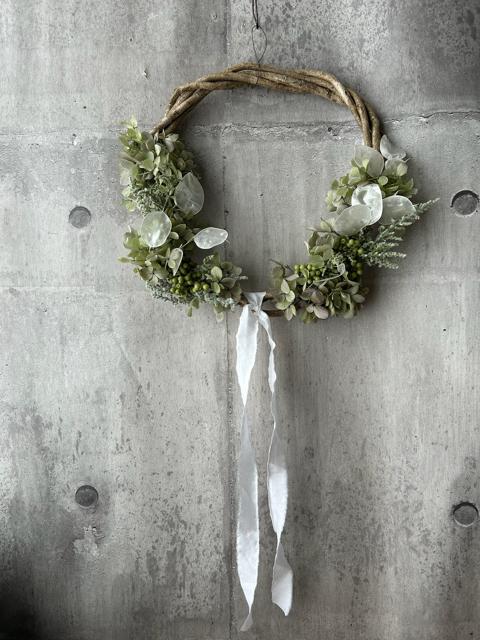 サイズ約29×33㎝長くお楽しみ頂けるプリザーブドフラワーで仕上げました。やわらかい曲線のツルにアジサイたっぷりとルナリアをキラキラさせました。時間経過によりいずれはゆっくりと退色していきますが、飾る場所によって色もちは異なります。なるべく光や日差しが当たらない涼しい屋内の場所ですと、いい状態を保ちやすいです。お花が過ごしやすい場所に飾ってあげるのもいいのですが、お客様が1番飾りたい場所で飾っていただくのもいいかもしれません。