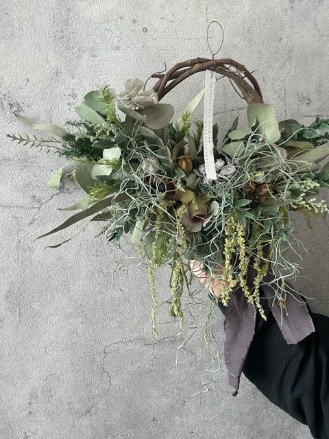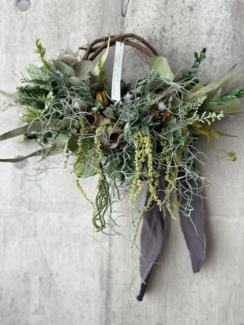 サイズ約28×35㎝ユーカリやグリーンの色々を楽しむためのドライフラワーです。たくさんの植物を集めて形にしたら生命が宿ったような動きが作れました。グリーン系が目に優しいです。ドライならではのナチュラル感をお楽しみください。適した環境は涼しめの光が当たりにくい暗い場所が1番いい状態を長く保ちます。次に日陰です。
