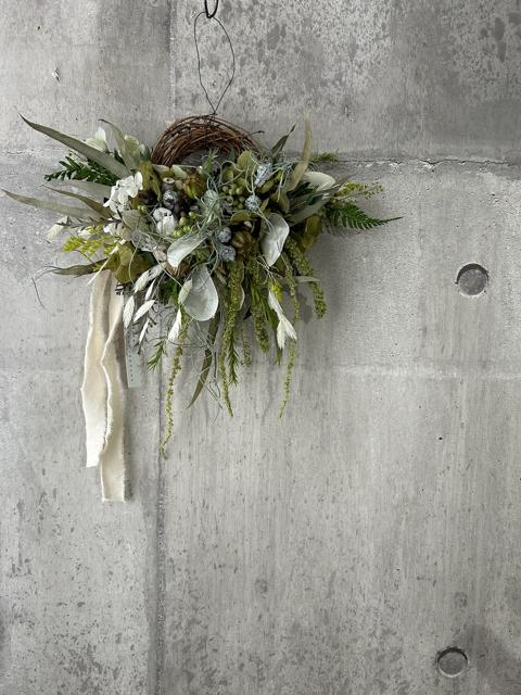 サイズ約23×25㎝長くお楽しみ頂けるプリザーブドフラワーで仕上げました。色んなグリーンの中にキラキラルナリアと優しい実など合わせました。時間経過によりいずれはゆっくりと退色していきますが、飾る場所によって色もちは異なります。なるべく光や日差しが当たらない涼しい屋内の場所ですと、いい状態を保ちやすいです。お花が過ごしやすい場所に飾ってあげるのもいいのですが、お客様が1番飾りたい場所で飾っていただくのもいいかもしれません。