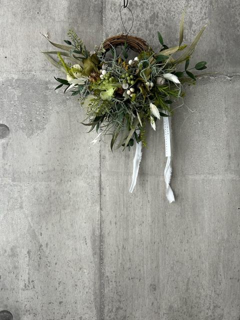 サイズ約20×25㎝長くお楽しみ頂けるプリザーブドフラワーで仕上げました。色んなグリーンの中にキラキラルナリアと優しい実など合わせました。時間経過によりいずれはゆっくりと退色していきますが、飾る場所によって色もちは異なります。なるべく光や日差しが当たらない涼しい屋内の場所ですと、いい状態を保ちやすいです。お花が過ごしやすい場所に飾ってあげるのもいいのですが、お客様が1番飾りたい場所で飾っていただくのもいいかもしれません。