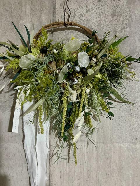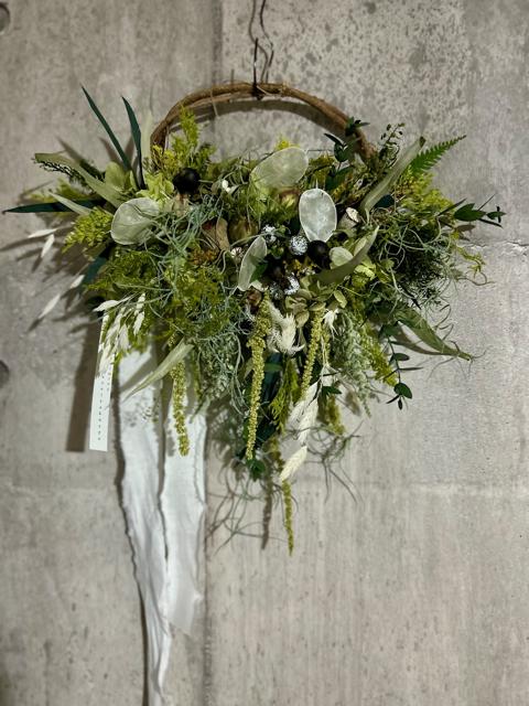 サイズ約30×32㎝色々な緑を楽しむためのプリザーブドフラワーのリースです。色んな日々の中でグリーンを目に留めて少し深呼吸してまたゆっくり進んでいただけるような癒されていただきたい気持ちで作っています。たくさんの植物を集めて形にしたら生命が宿ったような動きが作れました。グリーン系が目に優しいです。ドライならではのナチュラル感をお楽しみください。適した環境は涼しめの光が当たりにくい暗い場所が1番いい状態を長く保ちます。次に日陰です。
