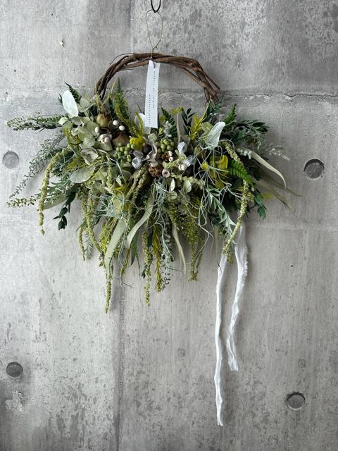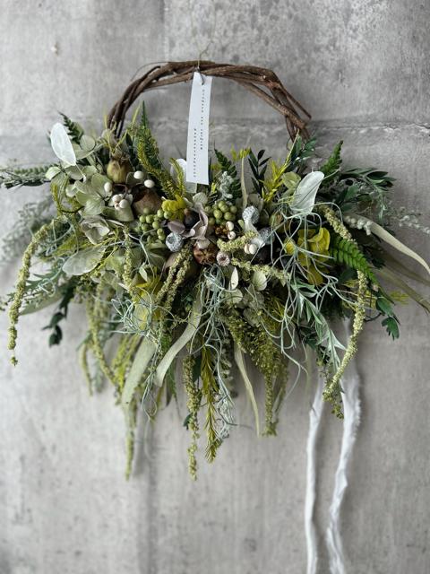 サイズ約34×36㎝色々な緑を楽しむためのプリザーブドフラワーのリースです。色んな日々の中でグリーンを目に留めて少し深呼吸してまたゆっくり進んでいただけるような癒されていただきたい気持ちで作っています。たくさんの植物を集めて形にしたら生命が宿ったような動きが作れました。グリーン系が目に優しいです。ドライならではのナチュラル感をお楽しみください。適した環境は涼しめの光が当たりにくい暗い場所が1番いい状態を長く保ちます。次に日陰です。