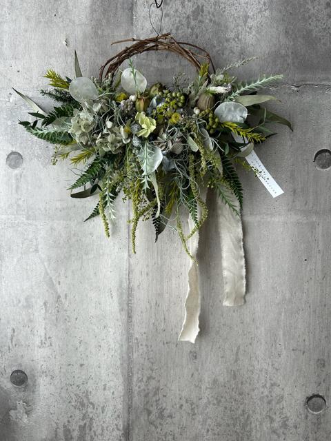 サイズ約27×35㎝色々な緑を楽しむためのプリザーブドフラワーのリースです。色んな日々の中でグリーンを目に留めて少し深呼吸してまたゆっくり進んでいただけるような癒されていただきたい気持ちで作っています。たくさんの植物を集めて形にしたら生命が宿ったような動きが作れました。グリーン系が目に優しいです。ドライならではのナチュラル感をお楽しみください。適した環境は涼しめの光が当たりにくい暗い場所が1番いい状態を長く保ちます。次に日陰です。