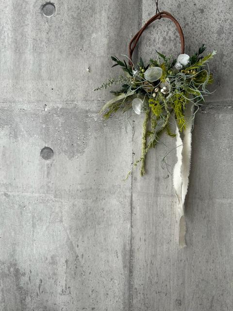 サイズ約25×18㎝色々な緑を楽しむためのプリザーブドフラワーのリースです。色んな日々の中でグリーンを目に留めて少し深呼吸してまたゆっくり進んでいただけるような癒されていただきたい気持ちで作っています。たくさんの植物を集めて形にしたら生命が宿ったような動きが作れました。グリーン系が目に優しいです。ドライならではのナチュラル感をお楽しみください。適した環境は涼しめの光が当たりにくい暗い場所が1番いい状態を長く保ちます。次に日陰です。