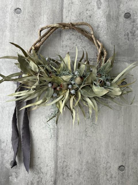 サイズ約38×46㎝シンプルなユーカリのリース。長くお楽しみ頂けるプリザーブドフラワーで仕上げました。時間経過によりいずれはゆっくりと退色していきますが、飾る場所によって色もちは異なります。なるべく光や日差しが当たらない涼しい屋内の場所ですと、いい状態を保ちやすいです。お花が過ごしやすい場所に飾ってあげるのもいいのですが、お客様が1番飾りたい場所で飾っていただくのもいいかもしれません。