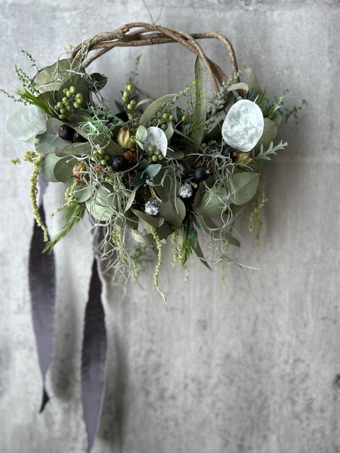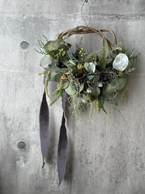 サイズ約26×30㎝ユーカリ2種を楽しむためのドライフラワーです。ユーカリが主役のナチュラルリース。ほのかに残るユーカリの優しい香りをお楽しみください。ユーカリと相性の良いルナリアやモス、ユーカリの実を合わせてより生命が宿ったような動きも作りました。ペッパーベリーやモスなどグリーン系が目に優しいです。適した環境は涼しめの光が当たりにくい暗い場所が1番いい状態を長く保ちます。次に日陰です。