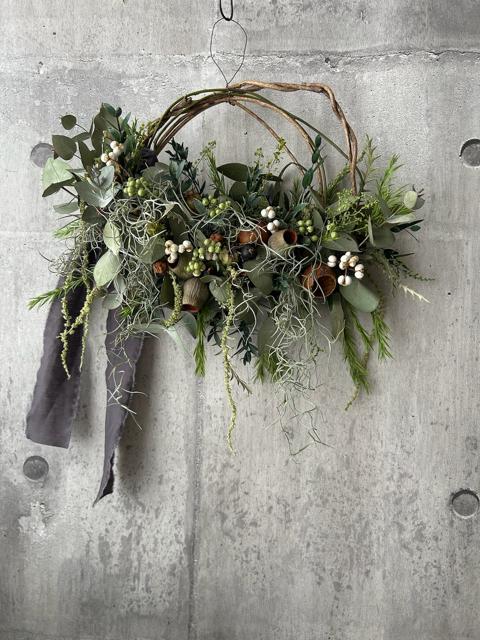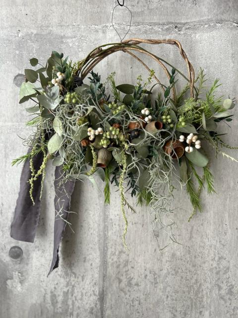 サイズ約27×35㎝植物が踊るリース。たっぷりの緑を集めた贅沢なグリーンリース。ツルのナチュラルな曲線に合わせて形も無造作にいたしました。ほのかに残るユーカリの優しい香りをお楽しみください。ユーカリと相性の良いモスやユーカリの実を合わせてより生命が宿ったような動きも作りました。ペッパーベリーやモスなどグリーン系が目に優しいです。適した環境は涼しめの光が当たりにくい暗い場所が1番いい状態を長く保ちます。次に日陰です。