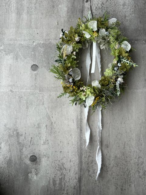 サイズ約30×24㎝長くお楽しみ頂けるプリザーブドフラワーで仕上げました。色んなグリーンの中にキラキラルナリアと優しい実など合わせました。形もカチッとしてるものではなく、やわらかい印象を大切に作りました。時間経過によりいずれはゆっくりと退色していきますが、飾る場所によって色もちは異なります。なるべく光や日差しが当たらない涼しい屋内の場所ですと、いい状態を保ちやすいです。お花が過ごしやすい場所に飾ってあげるのもいいのですが、お客様が1番飾りたい場所で飾っていただくのもいいかもしれません。