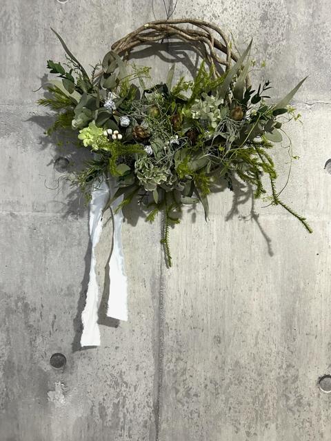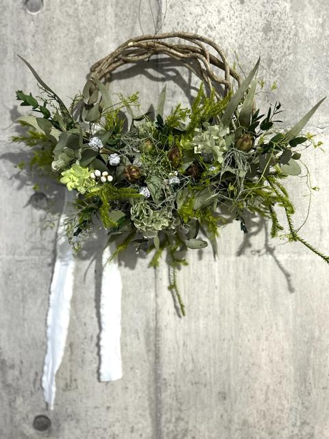 サイズ約38×28㎝植物が踊るリース。たっぷりの緑を集めた贅沢なグリーンリース。ツルのナチュラルな曲線に合わせて形も無造作にいたしました。ほのかに残るユーカリの優しい香りをお楽しみください。ユーカリと相性の良いモスやユーカリの実を合わせてより生命が宿ったような動きも作りました。モスの自然な動きもお気に入りです。適した環境は涼しめの光が当たりにくい暗い場所が1番いい状態を長く保ちます。次に日陰です。