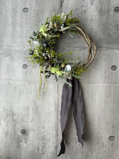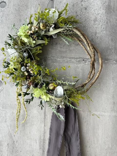 サイズ約30×28㎝植物が踊るリース。たっぷりの緑を集めた贅沢なグリーンリース。ツルのナチュラルな曲線に合わせて形もハーフリースに。ほのかに残るユーカリの優しい香りをお楽しみください。ユーカリと相性の良いモスやユーカリの実を合わせてより生命が宿ったような動きも作りました。たくさんの木の実やモスなどグリーン系が目に優しいです。適した環境は涼しめの光が当たりにくい暗い場所が1番いい状態を長く保ちます。次に日陰です。