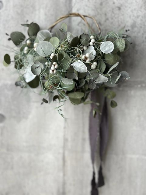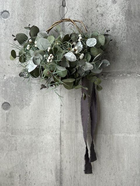 サイズ約20×26㎝ユーカリを楽しむためのドライフラワーです。ユーカリが主役の自然派のリース。ほのかに残るユーカリの優しい香りをお楽しみください。ユーカリと相性の良いルナリアとナンキンハゼのシンプルな仕上がりです。適した環境は屋内の冷暗所で光が当たりにくい室内の暗い場所が1番いい状態を長く保ちます。次に日陰です。