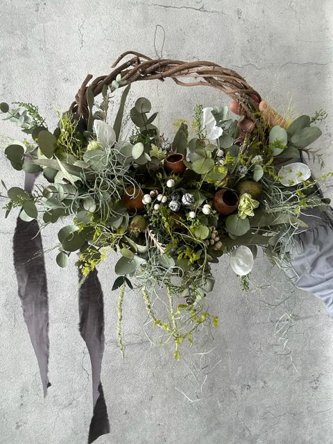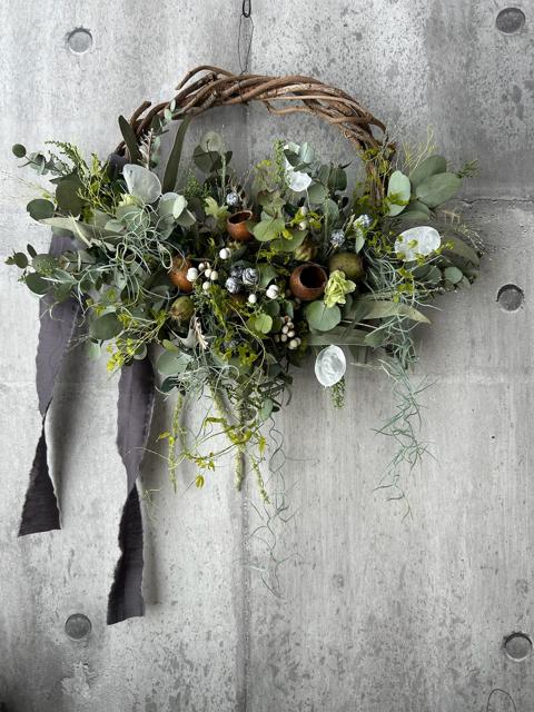 サイズ約27×30㎝ユーカリを楽しむためのドライフラワーです。ユーカリが主役の自然派のリース。ほのかに残るユーカリの優しい香りをお楽しみください。ユーカリと相性の良いルナリアやモス、葉をたくさん重ねました。適した環境は屋内の冷暗所で光が当たりにくい室内の暗い場所が1番いい状態を長く保ちます。次に日陰です。