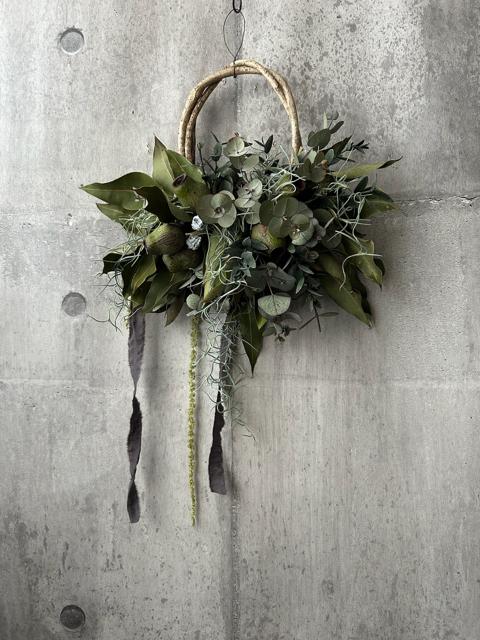 サイズ約28×26㎝ユーカリとユーカリの実を楽しむためのドライフラワーです。ユーカリが主役の自然派のリース。ほのかに残るユーカリの優しい香りをお楽しみください。ユーカリの実は2種使用。適した環境は屋内の冷暗所で光が当たりにくい室内の暗い場所が1番いい状態を長く保ちます。次に日陰です。