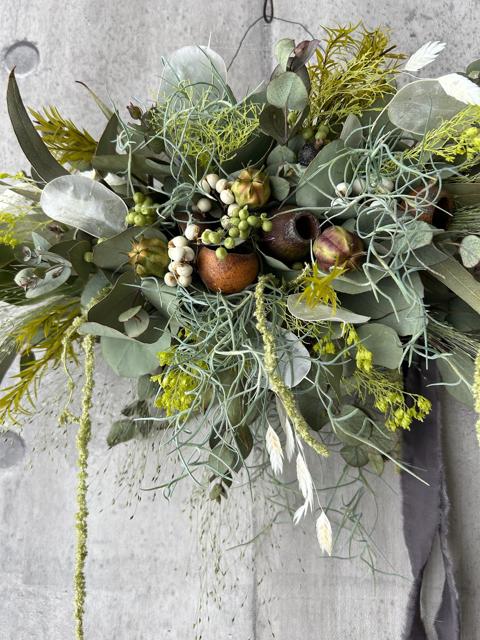 サイズ約23×40㎝ユーカリを楽しむためのドライフラワーです。ほのかに残るユーカリの優しい香りをお楽しみください。プリザーブドフラワーも合わせてあります。ユーカリにしか表現できない無造作ながらも優しい葉に癒されてください。適した環境は涼しめの光が当たりにくい暗い場所が1番いい状態を長く保ちます。次に日陰です。