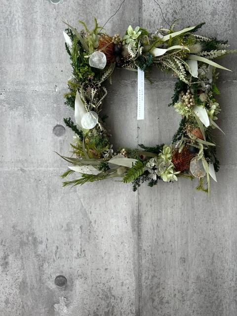 サイズ約30㎝植物のスクエア型のインテリア。プリザーブドフラワーで季節問わず飾っていただけるお花を目指しました。時間経過によりいずれはドライフラワーの方から先に退色していきます。光や日差しが当たらない涼しい屋内の場所ですと、いい状態を保ちやすいです。お花が過ごしやすい場所に飾ってあげるのもいいのですが、1番飾りたい場所で飾っていただくのもいいかもしれません。