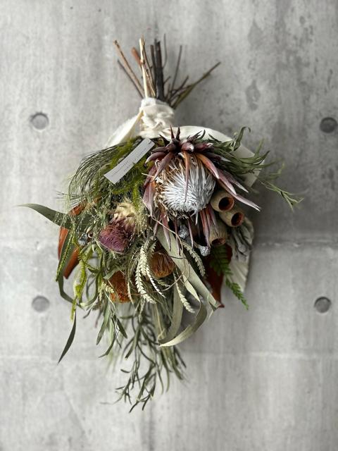 サイズ約50×30㎝ボリュームたっぷりのスワッグ。キングプロテアやアーティチョークやドライアンドラなど迫力ある花材を合わせました。プリザーブドフラワーとドライフラワーを混ぜ合わせたスワッグです。前撮りなどにもお使いいただける花材を集めました。なるべく長く維持するドライフラワーを厳選していますが、時間経過によりいずれはドライフラワーの方から先に退色していきます。光や日差しが当たらない涼しい屋内の場所ですと、いい状態を保ちやすいです。お花が過ごしやすい場所に飾ってあげるのもいいのですが、1番飾りたい場所で飾っていただくのもいいかもしれません。