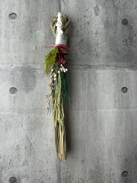 こちらは縄とお花を分けられますが和風の仕上がりとなります。縁起良いヒカゲノカズラ入り。大王松や南天の葉やナンキンハゼなどお正月らしいお色味に仕上げました。サイズ約55×8㎝和の雰囲気がお好きな方におすすめです。