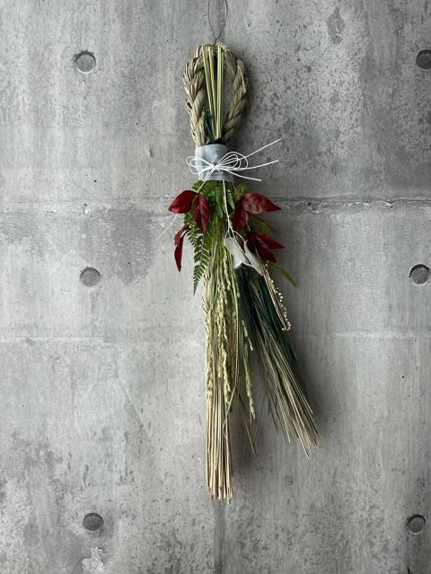 こちらは縄とお花を分けられますが和風の仕上がりとなります。縁起良いヒカゲノカズラ入り。大王松や南天の葉やナンキンハゼなどお正月らしいお色味に仕上げました。サイズ約60×12㎝和の雰囲気がお好きな方におすすめです。