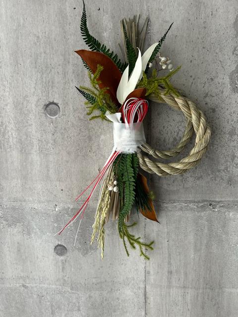 サイズ約43×20㎝松、ナンキンハゼ、ヒカゲノカズラとお正月らしい雰囲気が出せました。少し色味を明るめに作りました。植物は縄に直接ついているので取り外しはできませんがかっこよくシンプルがお好みの方におすすめです。落ち着いた雰囲気です。穏やかな1年になりますように。