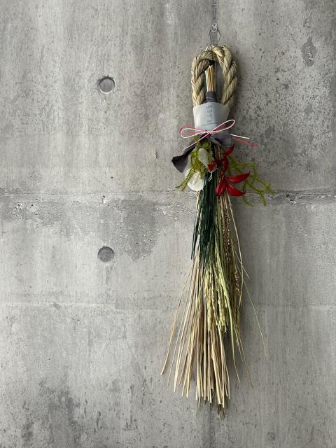 こちらは縄とお花を分けられますが和風の仕上がりとなります。縁起良いヒカゲノカズラ入り。大王松や南天の葉やルナリアなどお正月らしいお色味に仕上げました。サイズ約60×8㎝和の雰囲気がお好きな方におすすめです。