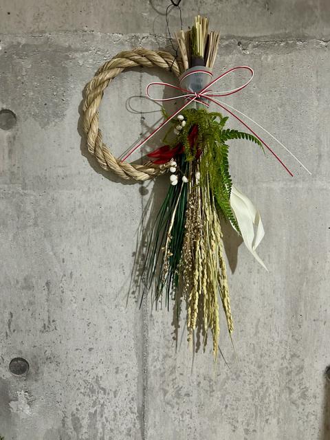 サイズ約40×15㎝こちらは縄とお花を分けられますが和風の仕上がりとなります。縁起良いヒカゲノカズラ入り。大王松や南天の葉やナンキンハゼなどお正月らしいお色味に仕上げました。サイズ約58×7㎝和の雰囲気がお好きな方におすすめです。