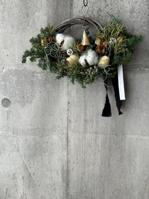 サイズ約15×23㎝。フレッシュからドライに乾燥しました。パリッと乾いているので杉の部分には触れずに優しくお取り扱いください。飾る場所は玄関内側ドアや、暖房をかけないお部屋、日陰がオススメ。クリスマスが近づいて来たら、みなさんのいるお部屋に移動させてあげるとリースもごきげんに過ごします。暖房の効いたお部屋は乾燥が早く進みます。室内日陰ですと冬の間変色することはないと思います。