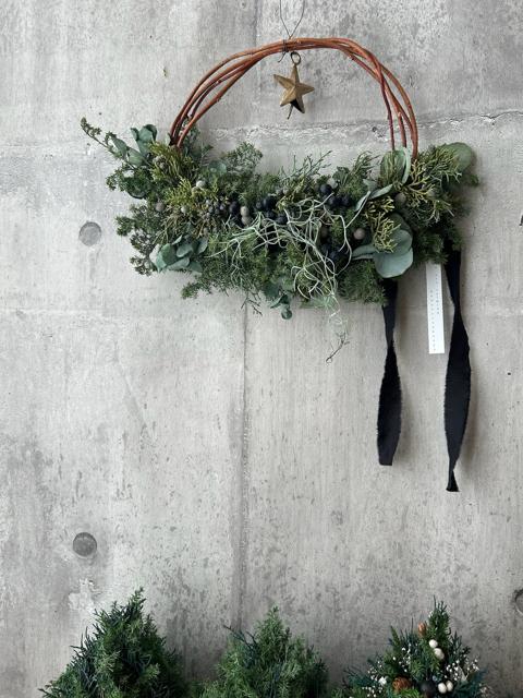 サイズ約23×32㎝。ドライフラワーのリースです。フレッシュからドライに乾燥しました。パリッと乾いているので杉の部分には触れずに優しくお取り扱いください。飾る場所は玄関内側ドアや、暖房をかけないお部屋、日陰がオススメ。クリスマスが近づいて来たら、みなさんのいるお部屋に移動させてあげるとリースもごきげんに過ごします。暖房の効いたお部屋は乾燥が早く進みます。室内日陰ですと冬の間変色することはないと思います。