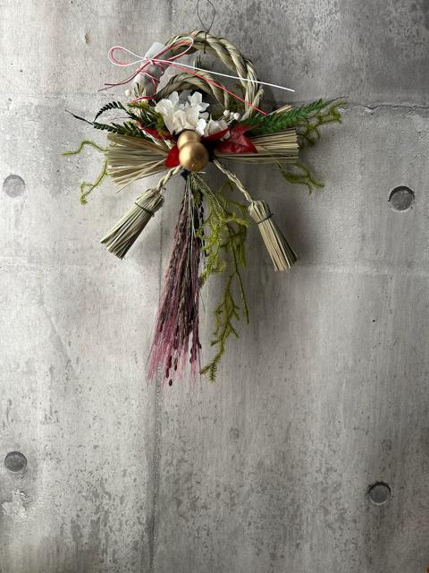 こちらは縄とお花が一体型で和風の仕上がりとなります。縁起良いヒカゲノカズラやひょうたんを合わせました。珍しい赤みのある稲穂や南天の葉などお正月らしいお色味に仕上げました。サイズ約35×25㎝和の雰囲気がお好きな方におすすめです。